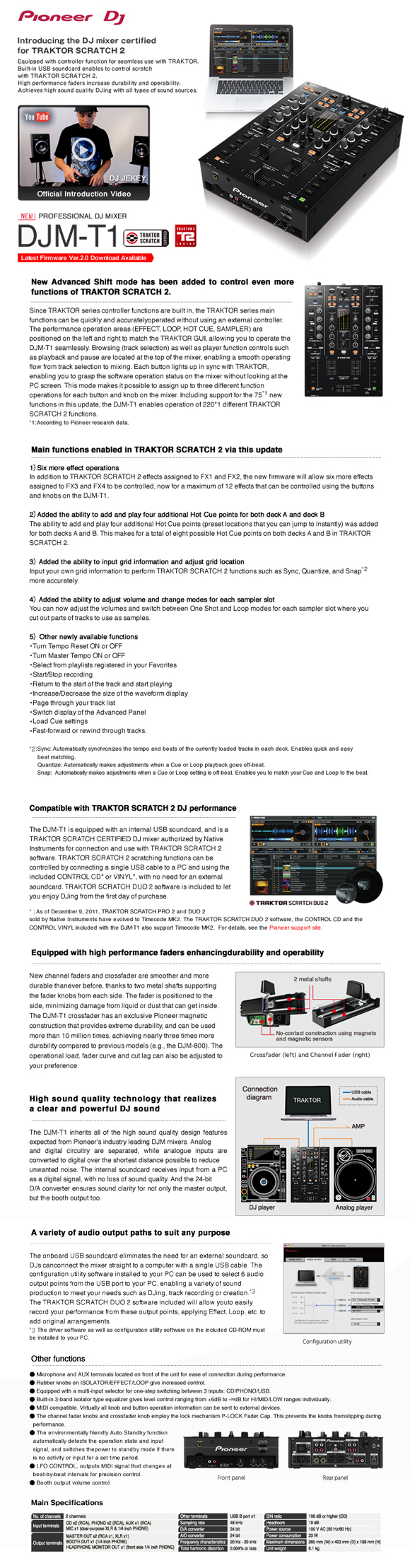 from Pioneer DJThe Pioneer DJM-T1 is the complete solution: a hybrid mixer, a controller and audio interface in one unit. Included in the box is a copy of TRAKTOR SCRATCH DUO 2 software, along with the control CD and vinyl needed for DVS scratch control. -